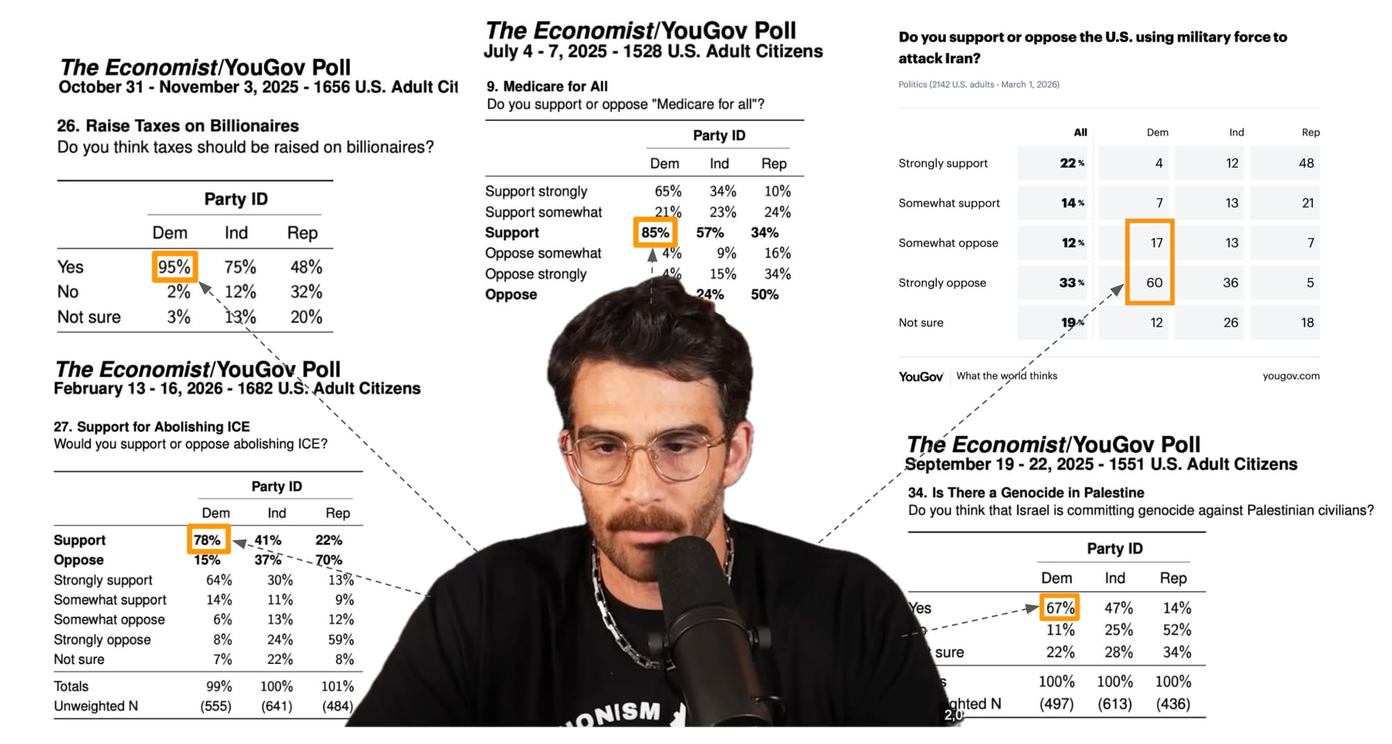 If you actually listen to what Piker says, he consistently communicates values that are extremely aligned with the Democratic base. This includes raising taxes on billionaires (95% support), pushing for Medicare-For-All (85% support), Abolishing ICE (78% support), opposing US military force in Iran (77% oppose) and that Israel committed a genocide in Palestine (67% Yes).