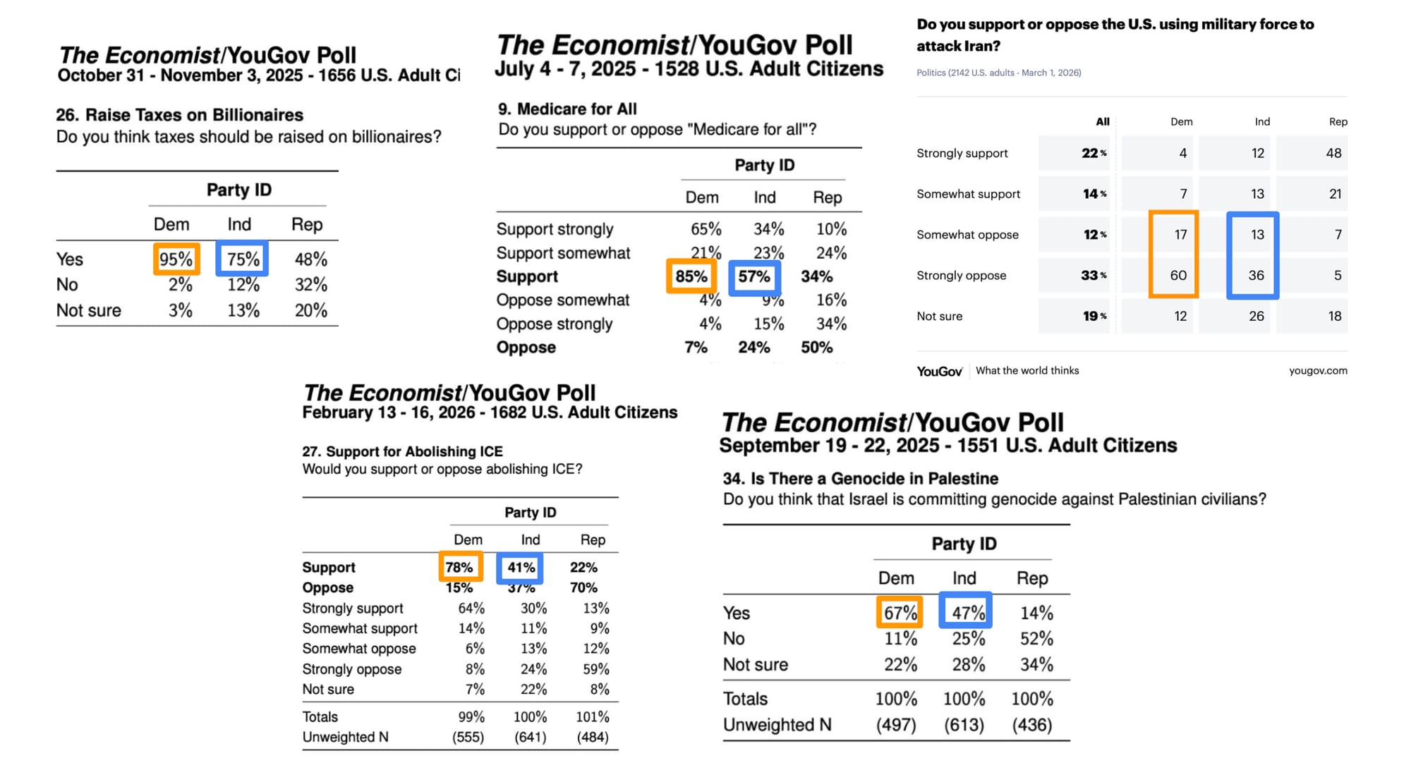 In those five polls I linked initially showing Democrats massively support Hasan's positions, every single one had net positive support from Independents!