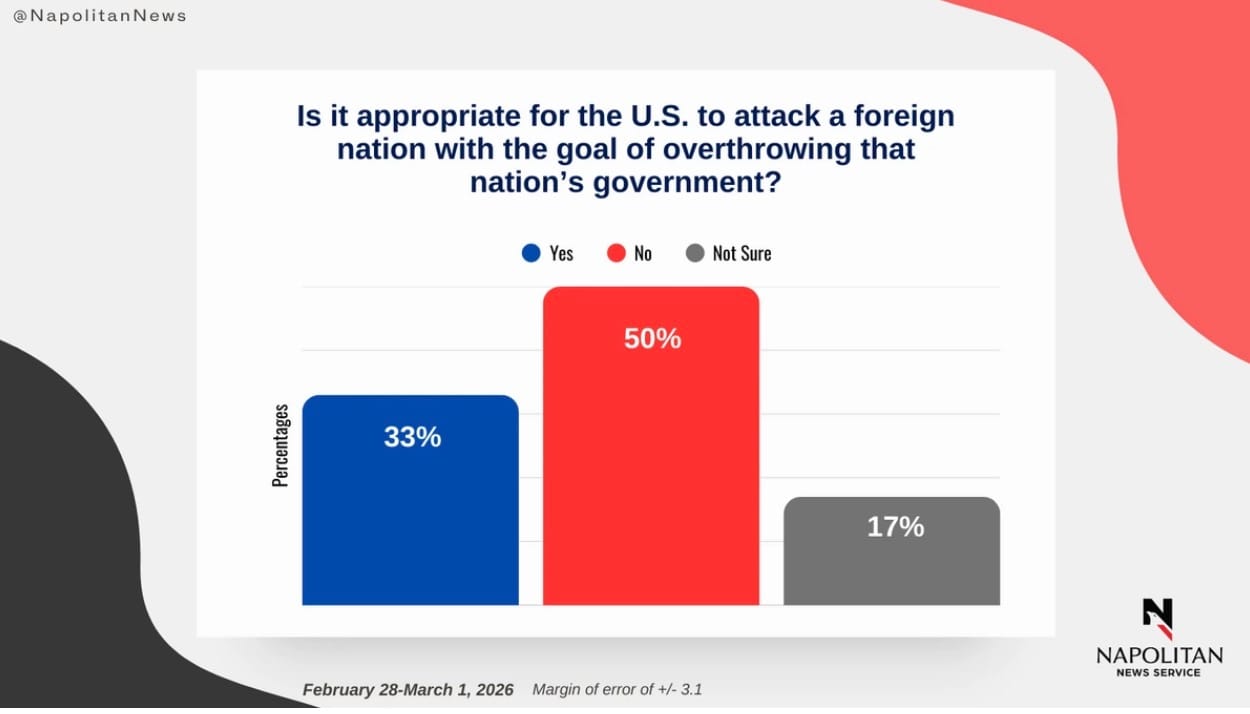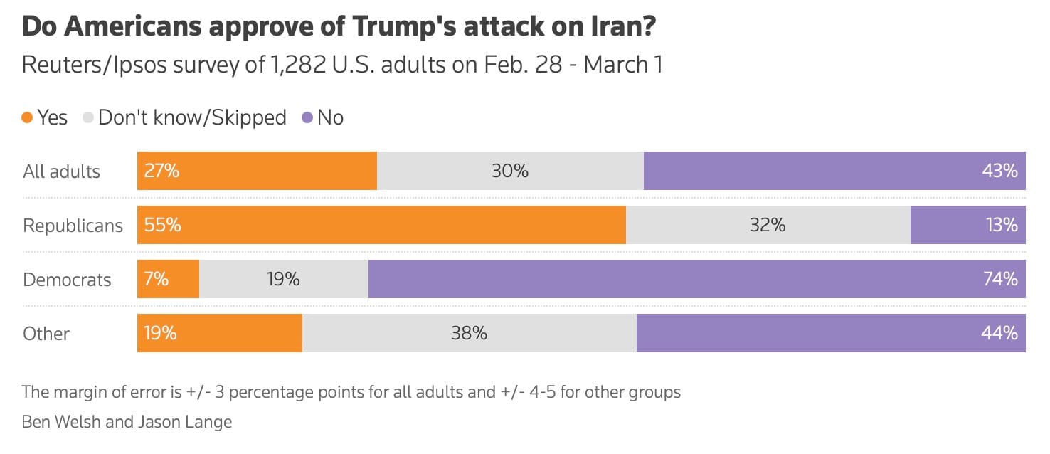 - Only 27% of Americans approve of Trump's attack on Iran versus 43% who oppose (net -16% support)