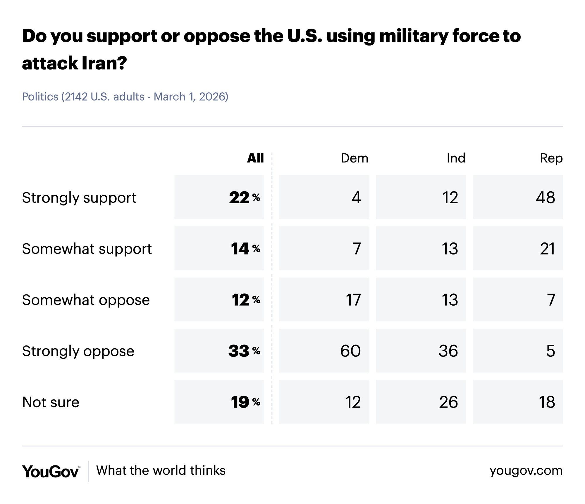 YouGov Poll, Conducted on Mar 1, 2026 (2,142 U.S. Adult Citizens)