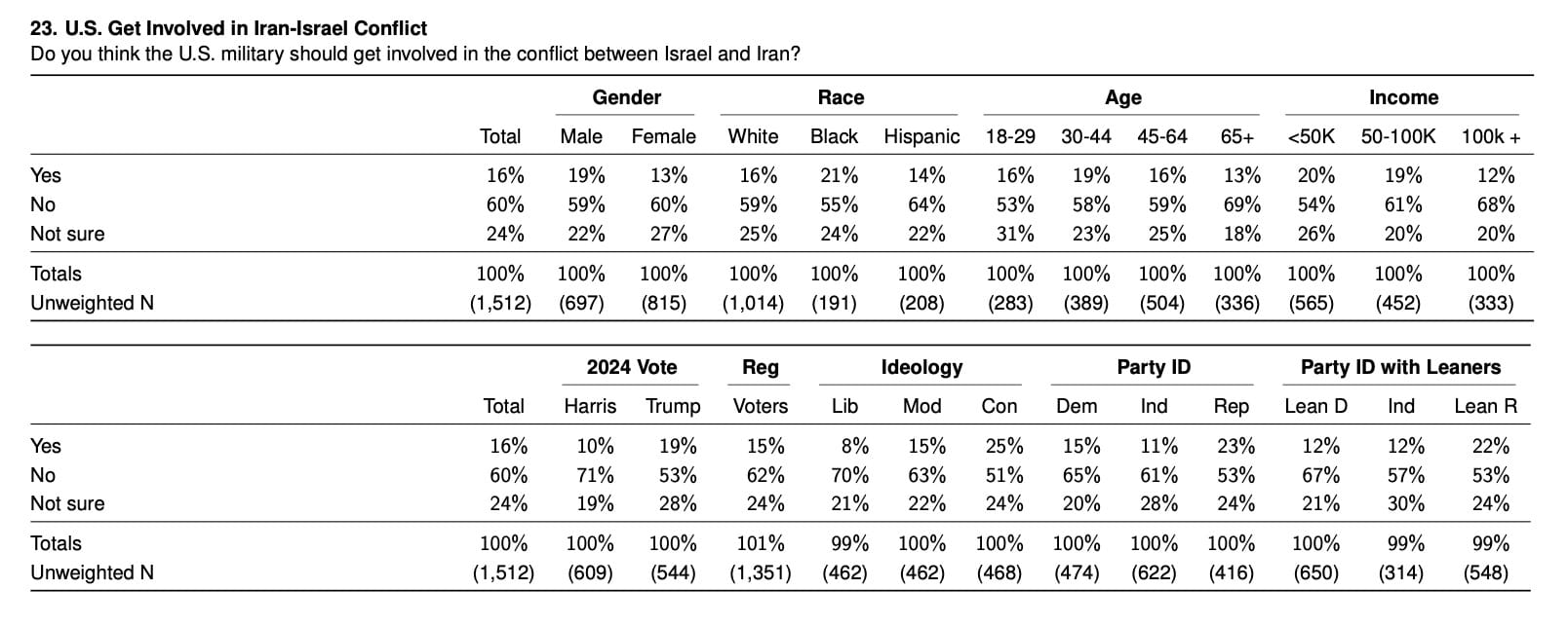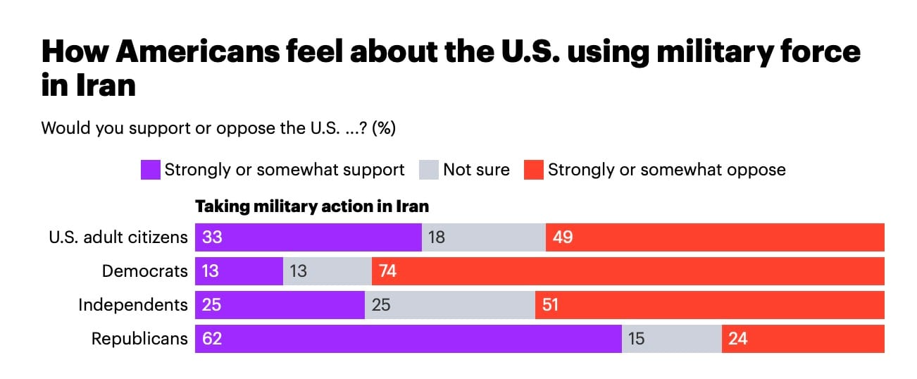 - 60% of Americans are against the U.S. military getting involved in the conflict between Israel and Iran, versus only 16% who are in favor (a net 44% against).