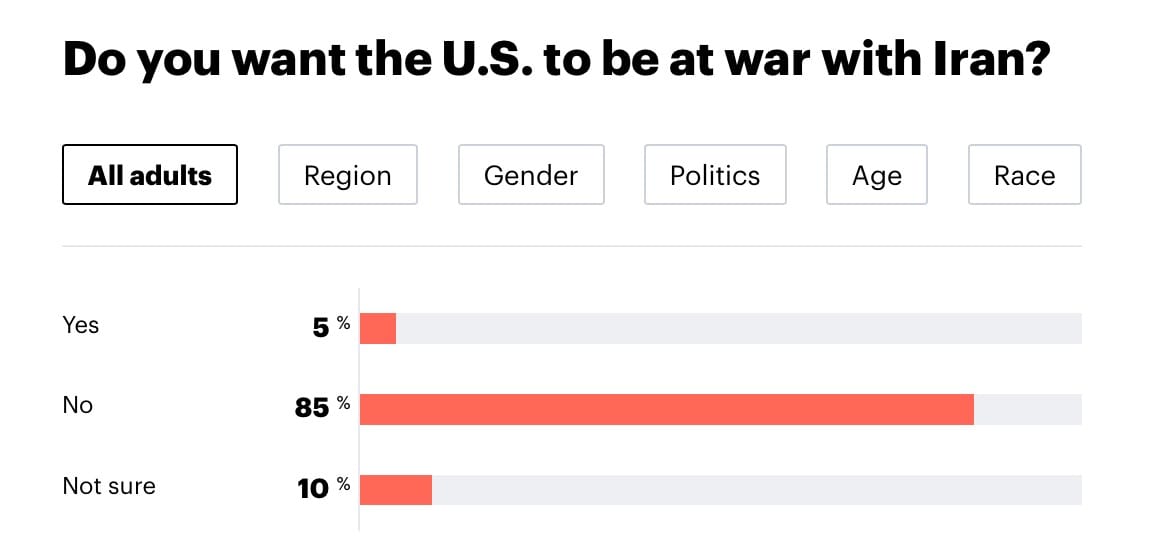 - 85% said they don't want war with Iran, versus 5% who do.