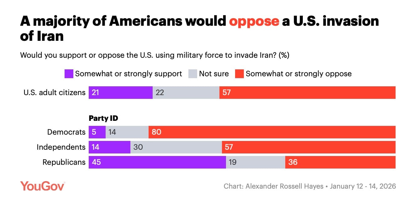 Only 21% support the US using military force to invade Iran, versus 57% who oppose.
