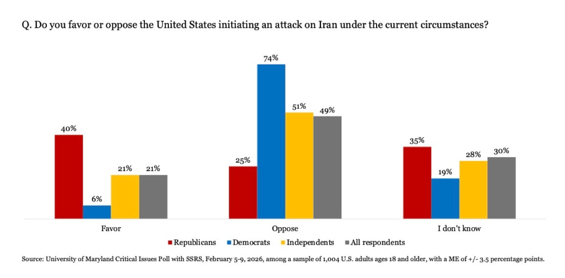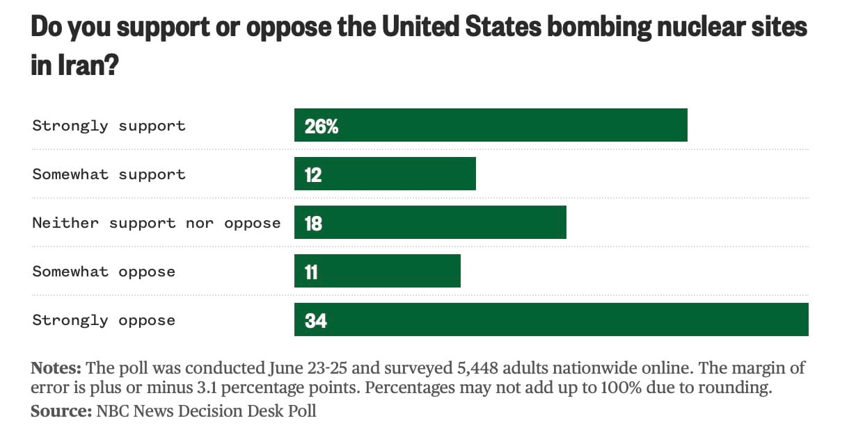 - Only 28% support bombing Iran versus 53% who oppose it.