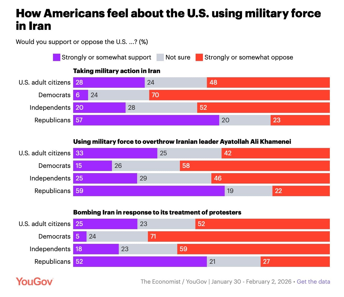 - Only 28% support military action in Iran with 48% against, a net -20% net support.