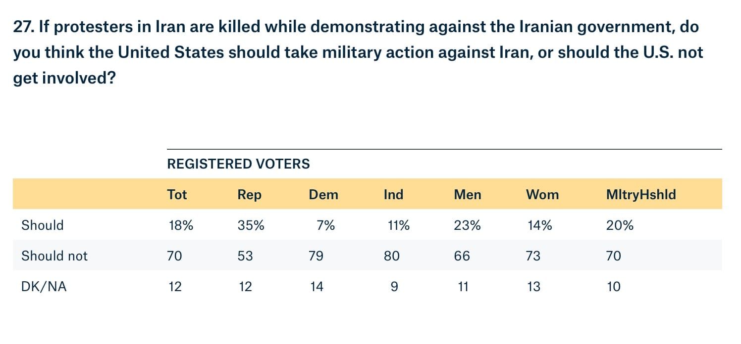 - 70% do not support US taking military action against Iran if Iran kills protestors. Only 18% support.