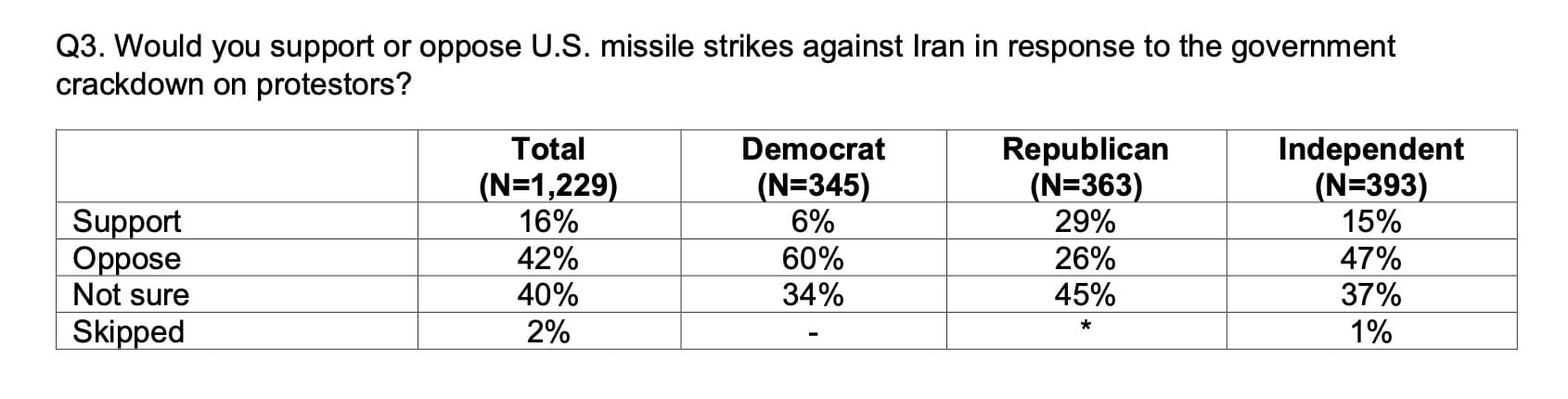 - 42% oppose US missile strikes against Iran in respond to the government crackdown on protestors. Only 16% support.