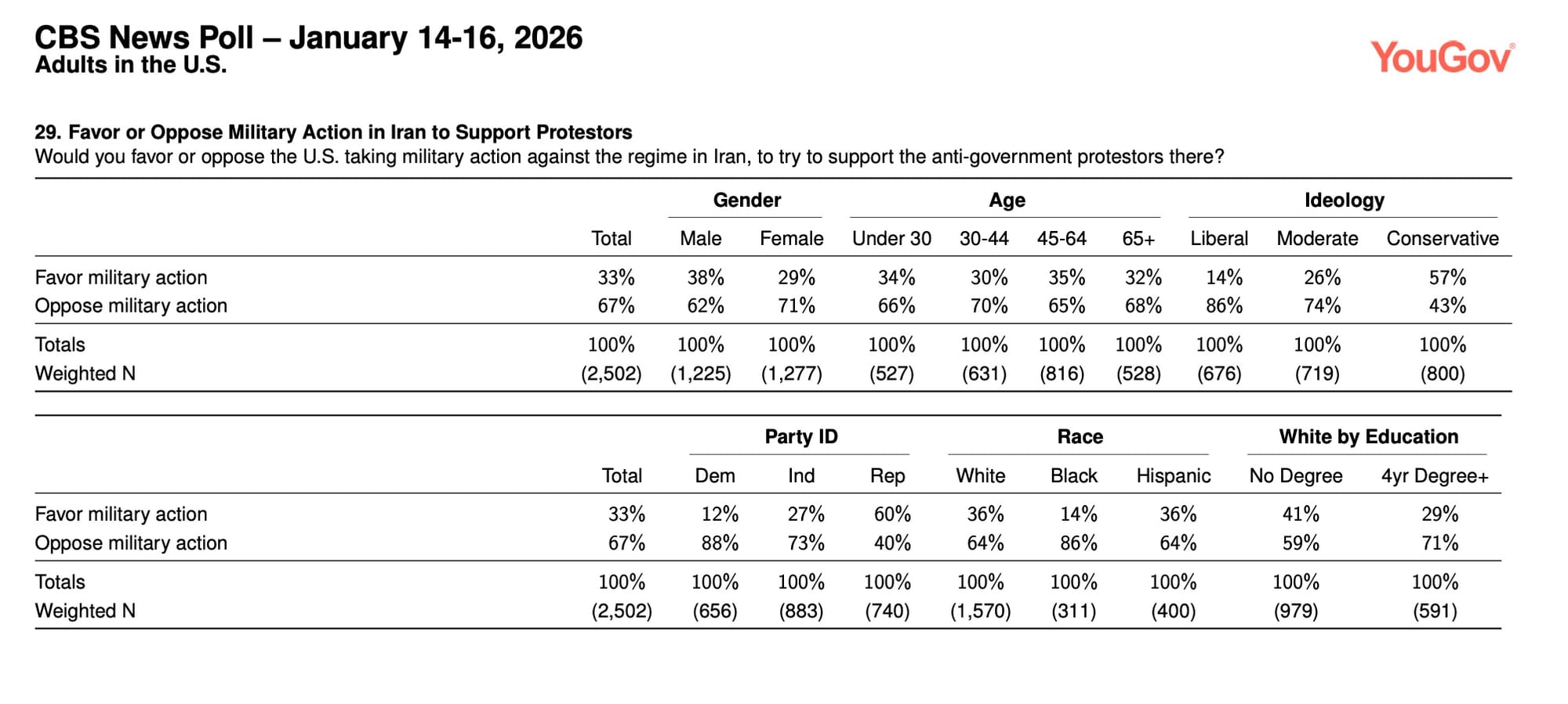 - 67% oppose military action in Iran versus 33% support.