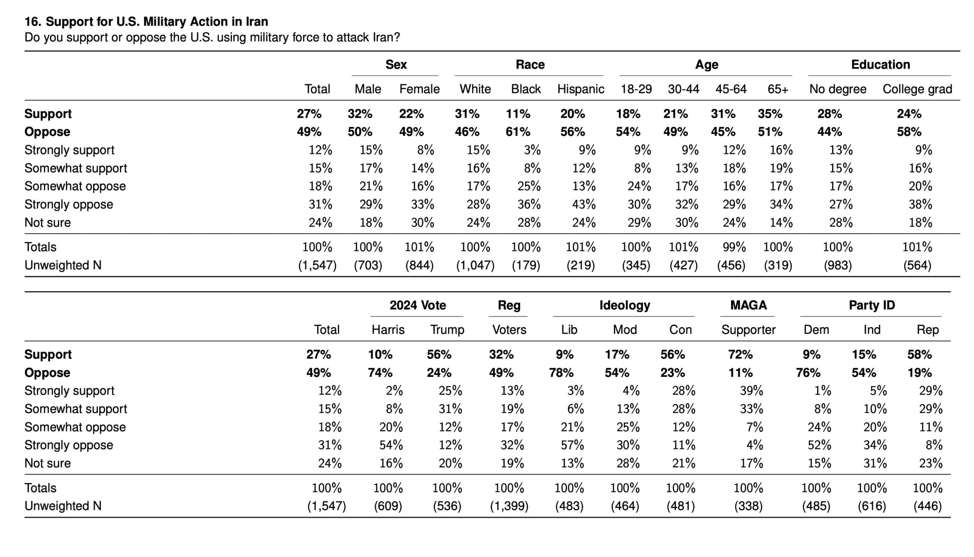 - Only 27% of Americans approve of Trump's attack on Iran versus 43% who oppose (net -16% support)