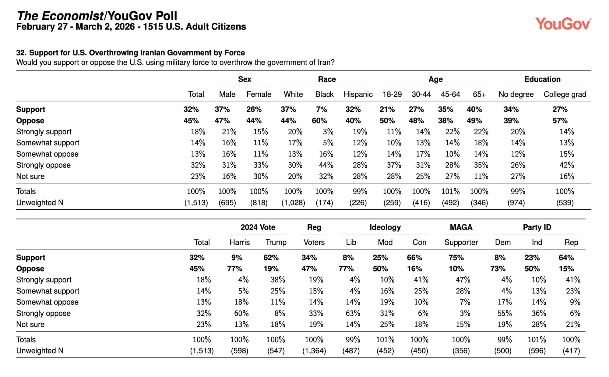 The Economist/YouGov Poll, Conducted From Feb 20 - 23, 2026 (1,551 U.S. Adult Citizens)